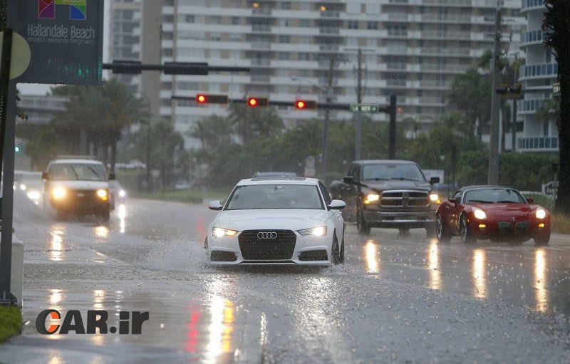 هنگامی که در هوای بارانی می رانید، آب گرفتگی های مسیر و دریاچه هایی که معمولا سرو کله شان وسط بزرگراه ها پیدا می شود، از بزرگترین خطرات در کمین شما هستند، زمانی که با سرعت وارد یکی از آن ها می شوید، به یکباره نیرویی بازدارنده را در مقابل حرکت خودرو حس میکنید (به این اتفاق، *آب سواری می گوییم)، همچنین احتمال اینکه فرمان خودرو به طور ناگهانی به یک سمت کشیده شده و باعث انحراف خودرو شود بسیار زیاد است، بنابراین زمانیکه در بارندگی سفر میکنید، نیروی بیشتری صرف هدایت فرمان خودرو کنید.