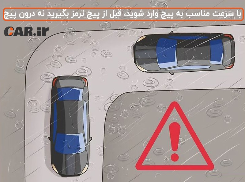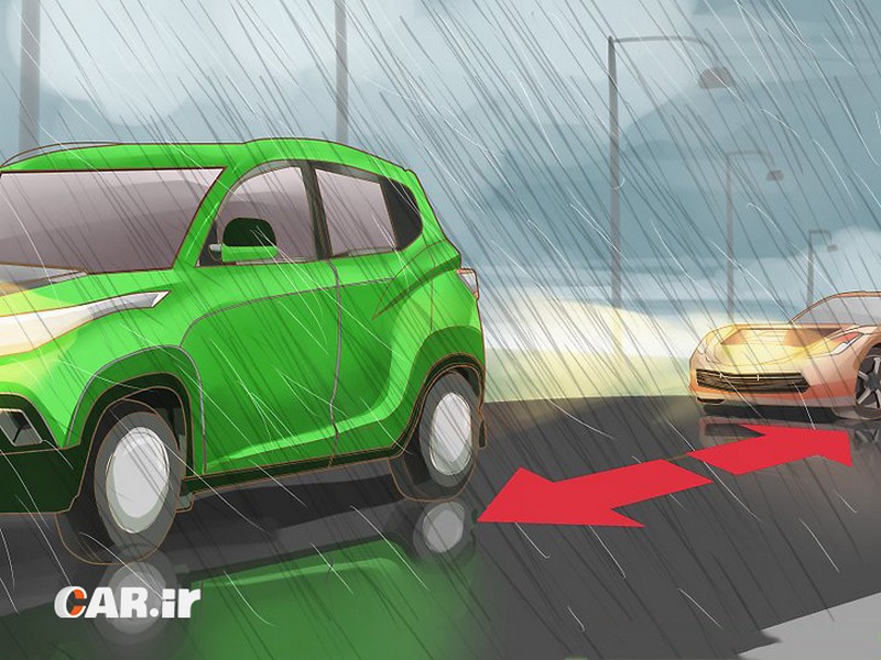 5) هنگام بارندگی، حداکثر سرعت های مجاز تعیین شده برای معابر مختلف کاهش می یابد و شما باید با سرعت کمتری رانندگی کنید. این احتیاط در سرعت، برای وقتی که تازه باران شروع شده هم صادق است. یعنی وقتی که تازه زمین تر شده، اصطکاک کاهش می یابد. به خصوص در اوایل بارندگی، به علت مخلوط شدن آلودگی های سطحی مانند روغن ماشین و گرد و خاک که به طور معمول روی سطح همه خیابان ها و جاده ها هست، حتی خطر جدی تر نیز می شود.