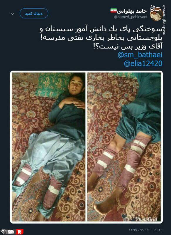 یک کاربر فضای مجازی در توییتر با انتشار تصویری از سوختگی پاهای یک دانش آموز در سیستان و بلوچستان، نوشت: