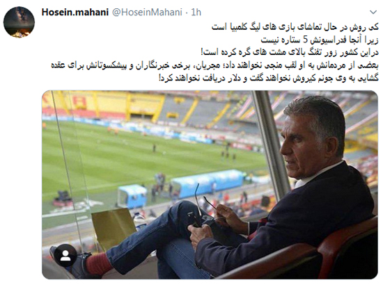 حسین ماهینی، بازیکن تیم پرسپولیس در واکنش به تماشای لیگ کلمبیا توسط کی روش در توئیتر خود نوشت: «کی روش در حال تماشای بازی های لیگ کلمبیا است زیرا آنجا فدراسیونش 5 ستاره نیست، دراین کشور زور تفنگ بالای مشت های گره کرده است! بعضی از مردمانش به او لقب منجی نخواهند داد؛ مجریان، برخی خبرنگاران و پیشکسوتانش برای عقده گشایی به وی جونم کیروش نخواهند گفت و دلار دریافت نخواهند کرد!»